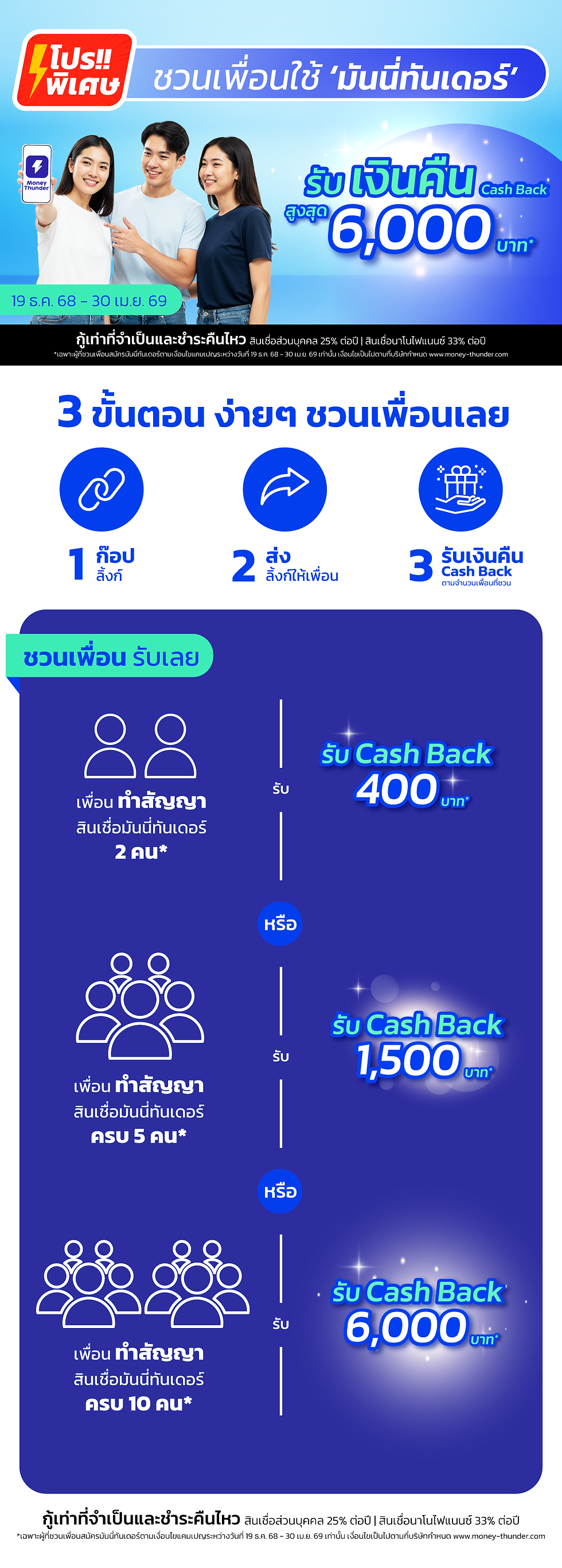 "ยิ่งชวน ยิ่งได้" ชวนเพื่อนใช้มันนี่ทันเดอร์ รับ Cash Back สูงสุด 6,000 บาท*